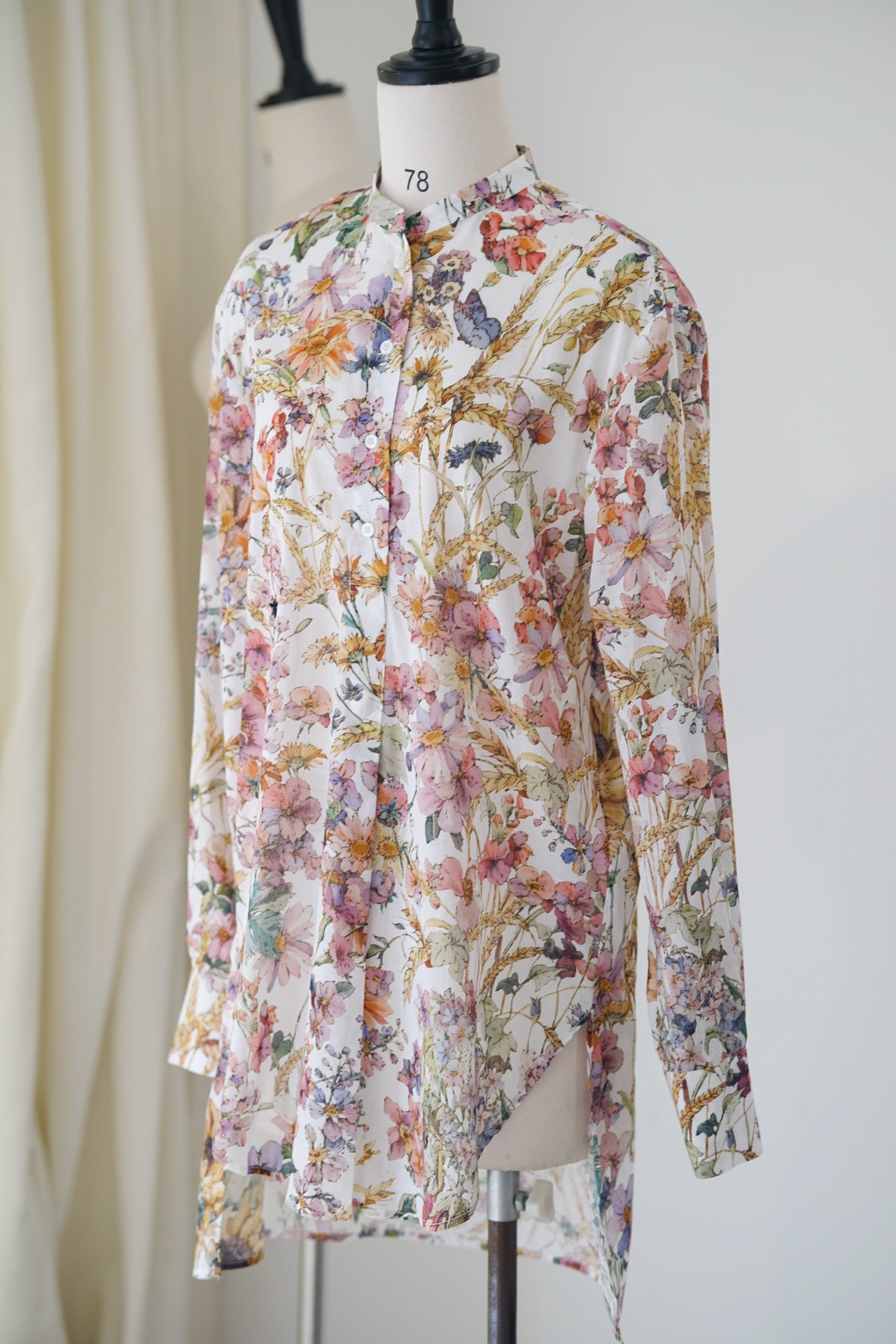 Summer floral design with a rustic feel Made of colorful silk fabric Fashionable short front and long back silhouette with stand-up collar and front button closure Leather belt can be worn to accentuate the waist for a sophisticated look.